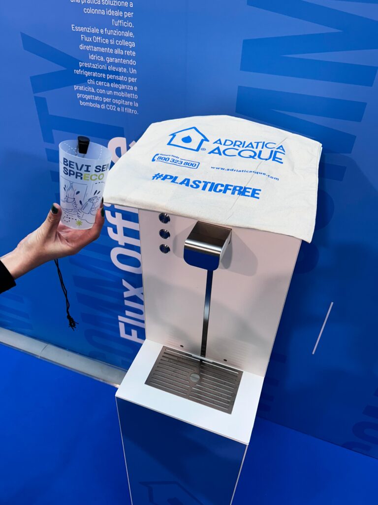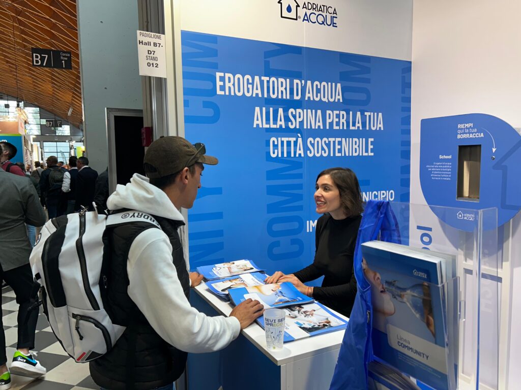 Successivamente, Amine e Alessandro si sono diretti verso lo stand di Adriatica Acque, partner per gli erogatori d’acqua. Per l’occasione abbiamo realizzato e distribuito bicchieri riutilizzabili a tutti coloro che desideravano utilizzare l’erogatore. Questa iniziativa ha promosso soluzioni ecologiche e sensibilizzato i visitatori sull’importanza di ridurre la plastica monouso, dimostrando che anche piccoli gesti possono contribuire a costruire una cultura più sostenibile.
